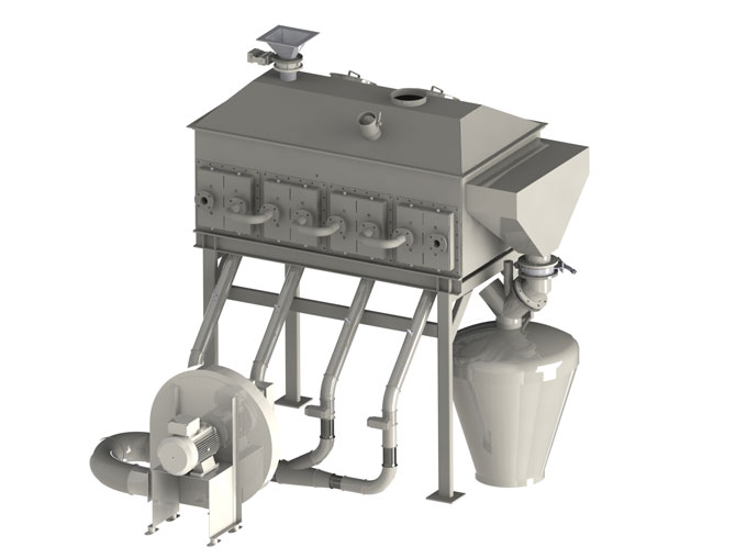 Mit diesem System ist eine exakte Temperaturregelung auch bei stark schwankenden Eingangsgrößen möglich. Durch die Fluidisierung können bei Bedarf gleichzeitig unerwünschte Feinanteile aus dem Schüttgut herausgeblasen werden (Sichtung).